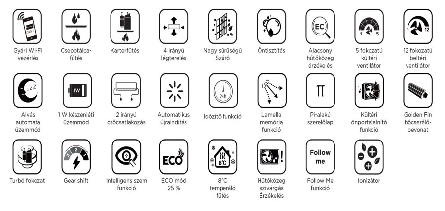Gyári Wi-Fi vezérlés, Follow Me funkció, 4 irányú légáram és lágy légáram funkció a huzatmentes komfortért; alvás (Sleep), időzítő és TURBO üzemmód, lamella memória, vészhelyzeti üzemmód, automatikus újraindítás áramszünet után, mindössze 1 W készenléti fogyasztás.